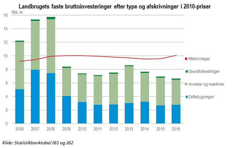 Uanset udviklingen i den undersøgte periode, viser en oversigt over investeringer i landbruget, at der i en længere periode er blevet afskrevet mere, end der blev investeret. Når dette sker, bliver den samlede værdi af aktiver i landbruget (fx maskiner, bygninger og inventar) mindre værd, da der på grund af nedslidning forsvinder mere værdi, end der tilføres. Optil 2008 lå landbrugets investeringer markant over afskrivningerne, men fra 2009 og frem til og med 2016 er der blevet afskrevet for mere, end der er investeret for. Investeringerne dækker over grundforbedringer, investeringer i inventar og maskiner samt investeringer i driftsbygninger.