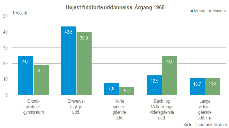 Blandt personerne, som er født i 1968, har mændene oftere grundskole eller erhvervsfaglig uddannelse som højeste uddannelse. Kvinderne har derimod oftere mellemlang videregående uddannelse.