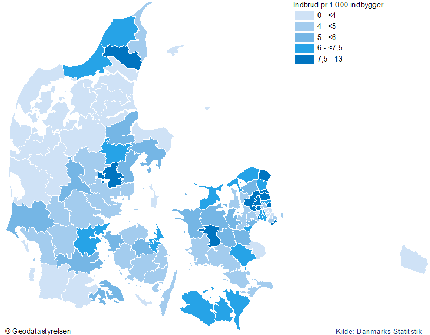 I den anden ende af skalaen blev der ikke anmeldt et eneste indbrud i ø-kommunerne Fanø, Læsø og Samsø i 2017. Udover disse kommuner var indbrudsraten per 1.000 indbygger lavest i Bornholm (0,3), Lemvig (0,9) og Struer (1,5) kommuner.
