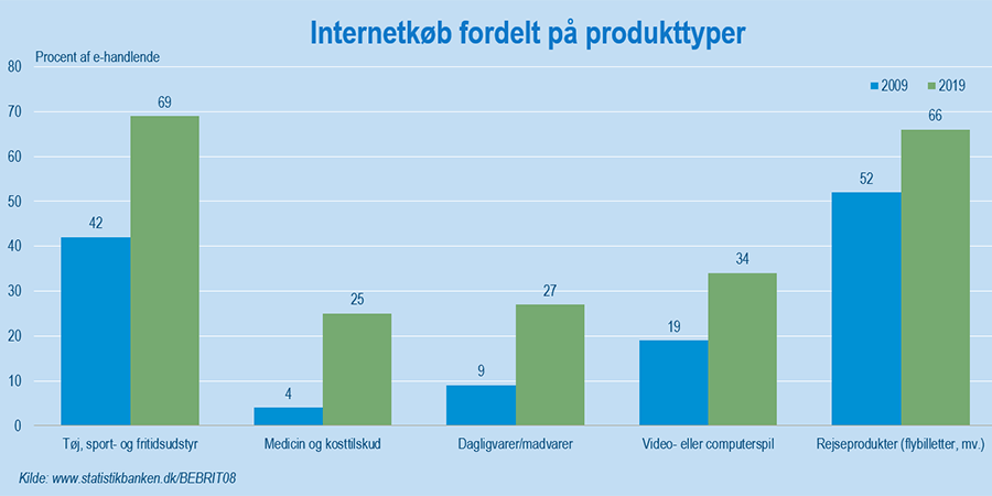 Fra 2009 til 2019 er andelen af danskere mellem 16 og 74 år, der handler på nettet, steget fra 64 procent til 84 procent. Vi køber alle mulige produkter på nettet, men et af de områder, der har oplevet størst fremgang de seneste ti år i forhold til internethandel er dagligvarer. Fra 2009 til 2019 er andelen af e-handlende, der meddeler, at de køber dagligvarer på nettet steget fra 9 til 27 procent – altså en stigning på 18 målt i procentpoint. Det svarer til en tredobling af andelen, der klikker sig til daglig- og madvarer på nettet. Sammenligner man med internetkøb af andre produkttyper, rækker udviklingen inden for dagligvarer til en andenplads, når man ser på, hvilke produkttyper der har oplevet den største relative stigning i internetkøb de seneste ti år. Den største stigning finder man i kategorien medicin og kosttilskud, hvor udviklingen er gået fra 4 til 25 procent over de seneste ti år.
