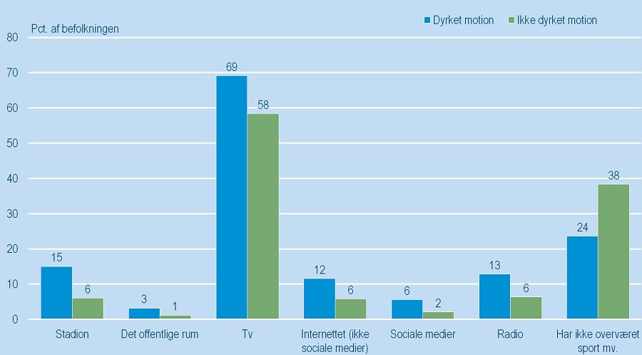 13 pct. af befolkningen tager jævnligt på stadion for at overvære sport, mens 67 pct. ser sport på tv, viser tal fra Danmarks Statistik. Lidt færre indvandrere og efterkommere overværer sport på stadion og tv, men de overværer i højere grad sport på sociale medier.
