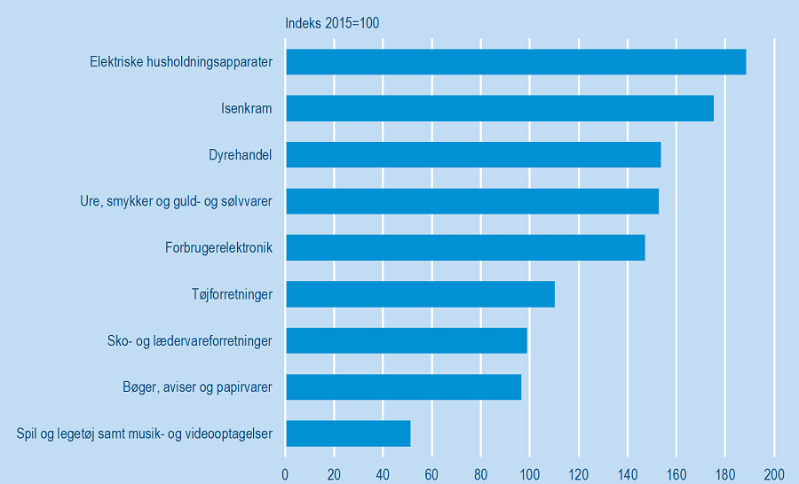Til gengæld er der i mindre grad indkøbt legetøj, sko og bøger i den tidlige julehandel i november i år. Sammenlignet med gennemsnittet de seneste fem år har disse brancher klaret sig dårligst i år. I november i år ligger de både under det gennemsnitlige niveau i 2015 og det gennemsnitlige salg i november de seneste fem år.