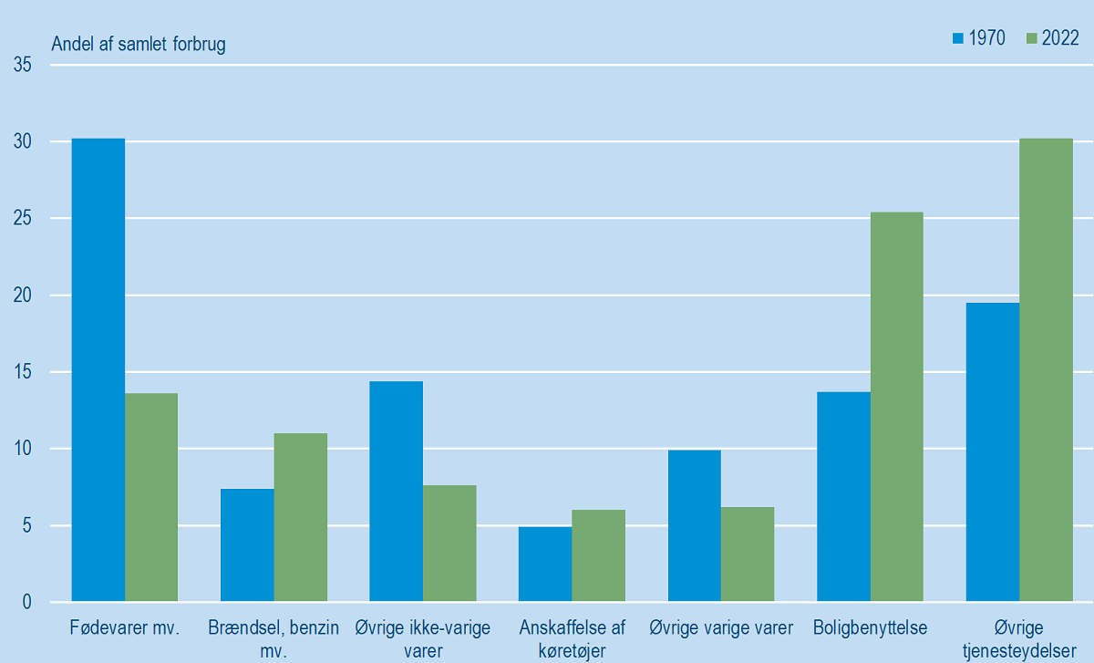 Den største andel af vores forbrug i 1970 gik til posten fødevarer, drikkevarer og tobak med 30,2 pct., mens den største post i 2022 var boligbenyttelse såsom husleje og vand med 25,4 pct.