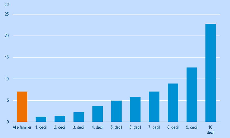 Hvis man i stedet ser på, hvordan de 224.000 sommerhusejere fordeler sig blandt befolkningen, ser det sådan ud: 32 pct. af sommerhusejerne kommer fra de 10 pct. af familierne, der udgør den højeste indkomstgruppe. Knap 7 pct. af sommerhusejerne kommer fra de 30 pct. af befolkningen, som tilsammen udgør de tre nederste indkomstgrupper.