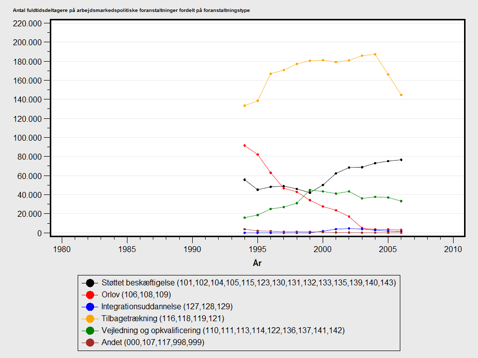 I 1996 blev statistikken suppleret med data for puljejob og voksen- og efteruddannelse. I 1997 stoppede ordningen med nedsatte dagpenge. Fra og med 3. kvartal 1998 indeholder statistikken data for kortvarige vejlednings- og introduktionsforløb. I 1999 stoppede sabbatorlov. I 2000 stoppede ordningerne etablering og igangsætning. I 2000 inkluderede statistikken for første gang integrationsuddannelse, fleksjob og skånejob. I løbet af 2001 blev puljejob udfaset. I 2001 inkluderede statistikken for første gang servicejob, voksenlærlinge og arbejdspraktik. I løbet af 2002 blev uddannelsesorlov udfaset. I 2002 blev intensiv jobsøgning og særlig formidling kortvarigt inkluderet i statistikken som selvstændige ordninger. Forældre til børn født senere end august 2002 kan ikke længere tildeles børnepasningsorlov til disse, hvilket i første omgang har givet udslag i et stagnerende lavt niveau.