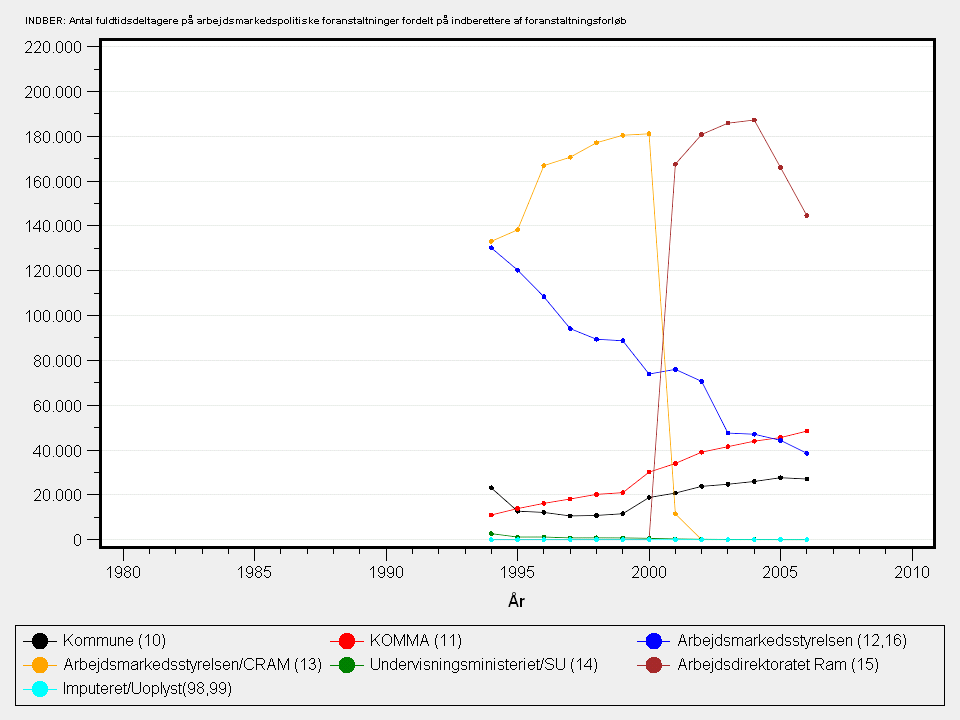 Variablen INDBER angiver hvilken dataleverandør, der har indberettet foranstaltningsforløbene.Bemærk, at kode 13 (Arbejdsmarkedsstyrelsen, CRAM) benyttes til definition af tilbagetrækning til og med 3. kvartal 2001. Den afløses af Arbejdsdirektoratet RAM (kode 15) der anvendt første gang i 4. kvartal 2001.