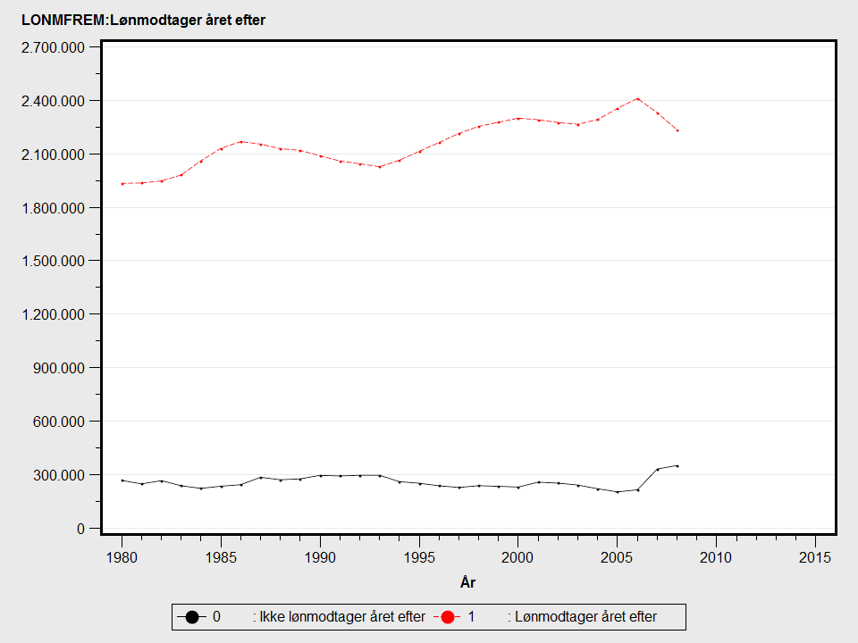 Faldet i antallet af lønmodtagere i 2007, der også er lønmodtagere året efter, skyldes at datagrundlaget for lønmodtagerbeskæftigelsen ændres til eIndkomst fra og med IDA2008. Faldet er forårsaget af, at der i 2008 er færre lønmodtagere. For yderligere infomation om eIndkomst se emnegruppen Beskæftigelse og herunder statistikområdebeskrivelsen "Befolkningens tilknytning til arbejdsmarkedet (RAS)".