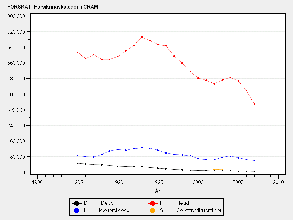 I værdisættet til variablen FORSKAT indgår i årene 2002-2003 midlertidigt en kode S= selvstændige. Denne er i CRAM sidenhen konverteret til H=Heltidsforsikrede i statistikbanken.Koden K = kombinationsforsikrede er en kombination af selvstændige (S) og heltidsforsikrede (H). Den indgår kun i DUR-registret som selvstændig kode (er registret som heltidsforsikrede i CRAM-registret). Der er antalsmæssigt under 100 pr. år.