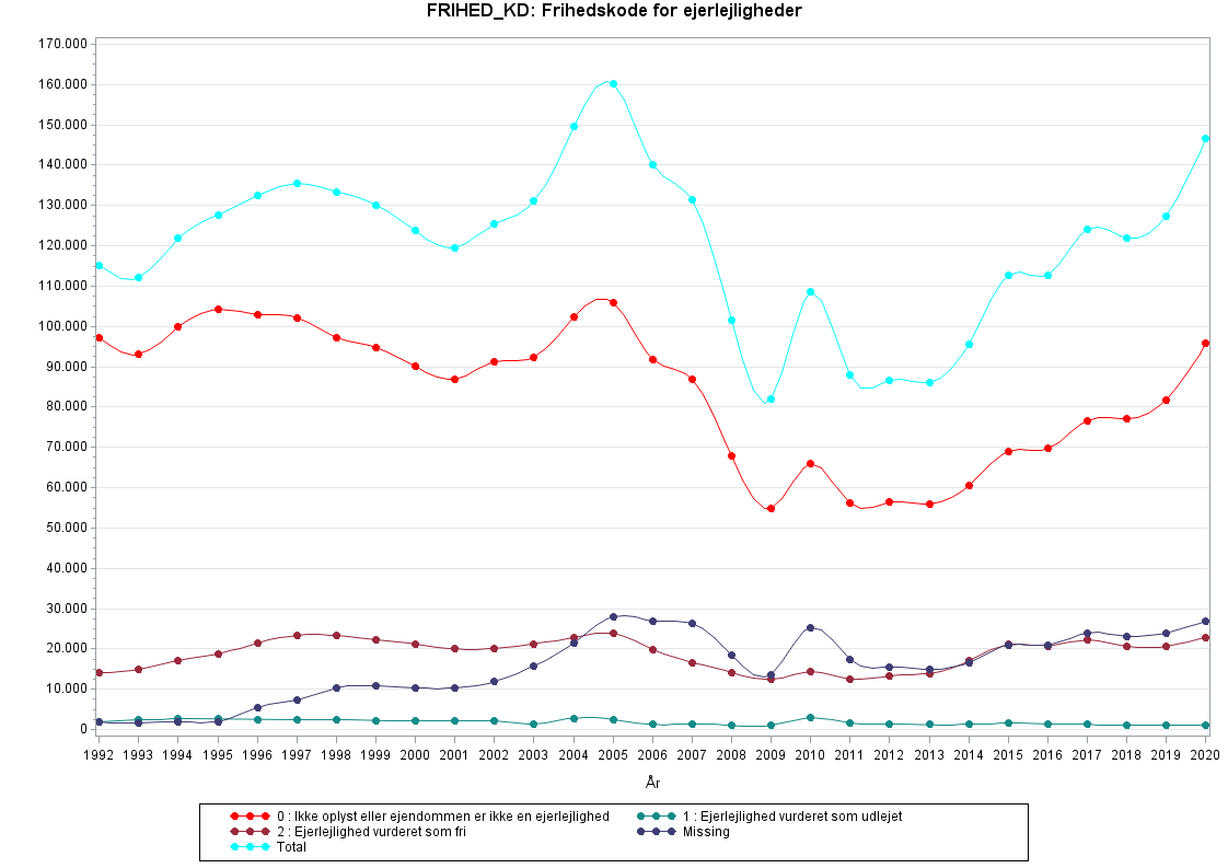 Udviklingen i grafen over FRIHED_KD=0 (uoplyst frihedskode) følger stort set udviklingen i antallet af ejendomssalg over tid. Antal handler med uoplyst frihedskode begynder at falde fra 2005-2006 og falder kraftigt 2007-2008 i forbindelse med finanskrisen. Der er mange missing i graf og tabel, fordi variablen kun gælder for ejerlejligheder.