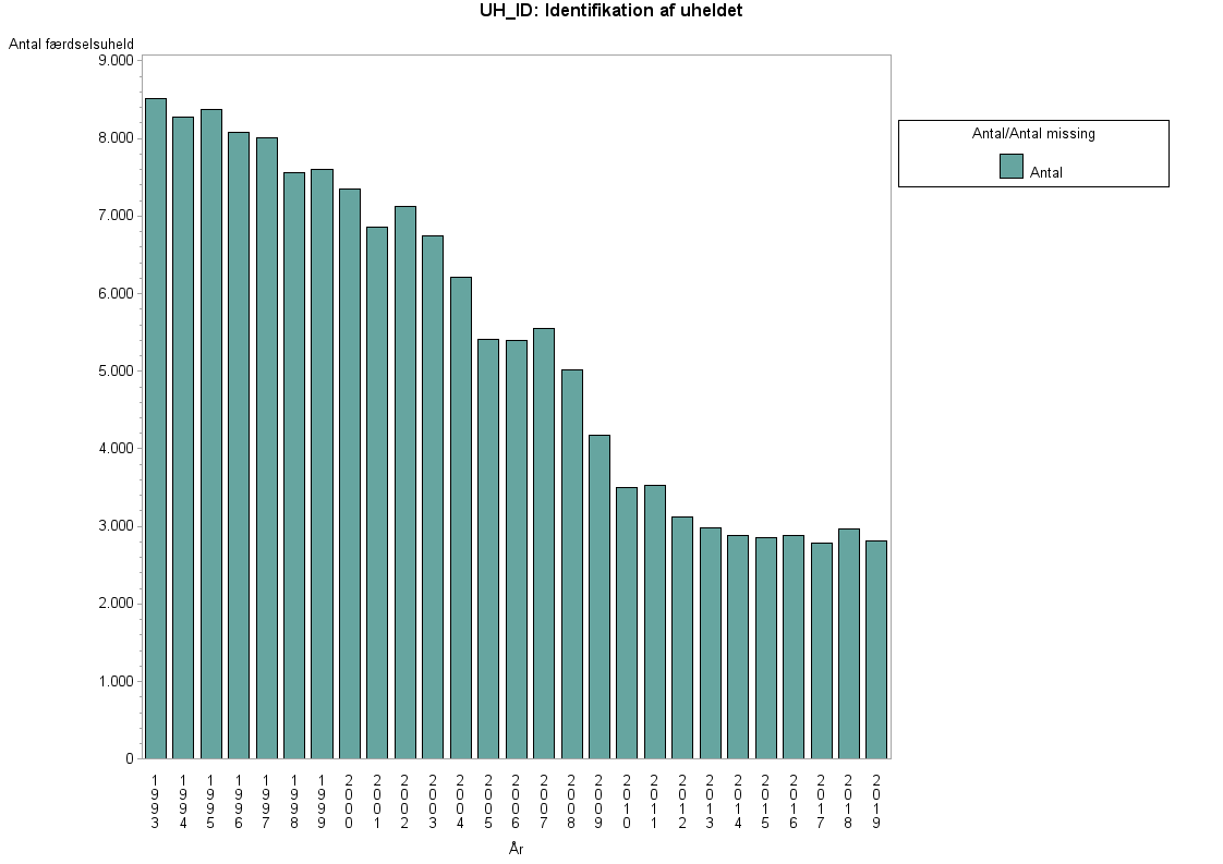 Statistikken om færdselsuheld kan opgøres på 3 enheder - dels færdselsuheld, dels elementer i færdselsuheldet og dels personer involveret i færdselsuheldet. UH_ID er den nøgle, der forbinder disse 3 enheder.Statistikken om færdselsuheld baseres på optælling af uhelds_id (UH_ID) og danner grundlag for belysning af de forhold, som uheldet skete under (vejr, sted, uheldssituation).