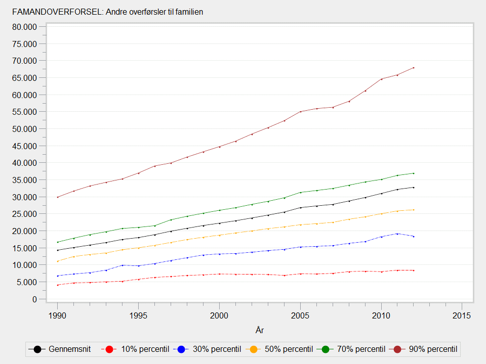 Populationen i datasæt, som udleveres af Forskningsservice, omfatter alle familier, som var bosiddende i Danmark pr. 31. december i indkomståret. I publikationer og statistikbanktabeller inkluderes kun familier, hvor mindst én voksen har været bosiddende i Danmark både primo og ultimo året (fuldt skattepligtige), og som ved årets udgang er mindst 15 år. For at genskabe denne population skal det betinges, at FAMANTALFSKATTEPLIGTIGE > 0. I vedhæftede tabel og graf er populationen den samme som den, Danmarks Statistik publicerer på, hvor FAMANTALFSKATTEPLIGTIGE > 0. Det er yderligere betinget, at beløbet er forskellig fra 0 i den vedhæftede figur og tabel.