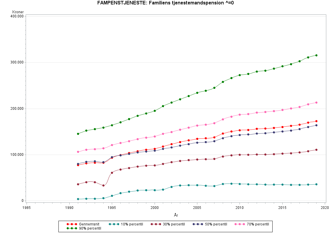 Familiens samlede udbetaling af tjenestemandspension.Danmarks Statistik har opgjort tjenestmandspensionen fra og med 1991. Før dette år ligger beløbet i variablen FAMRESTINDK
