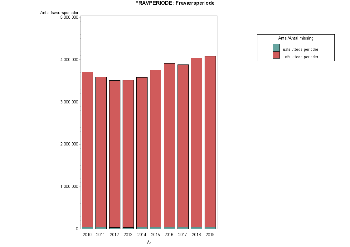Både afsluttede og uafsluttede fraværsperioder indgår i data. Hvis fraværsperioden er afsluttet i året har variablen fravperiode værdien 1. Er perioden uafsluttet i tællingsåret er variablen blank. En optælling på variablen vil stemme overens med de offentliggjorte tal i Statistikbanken.