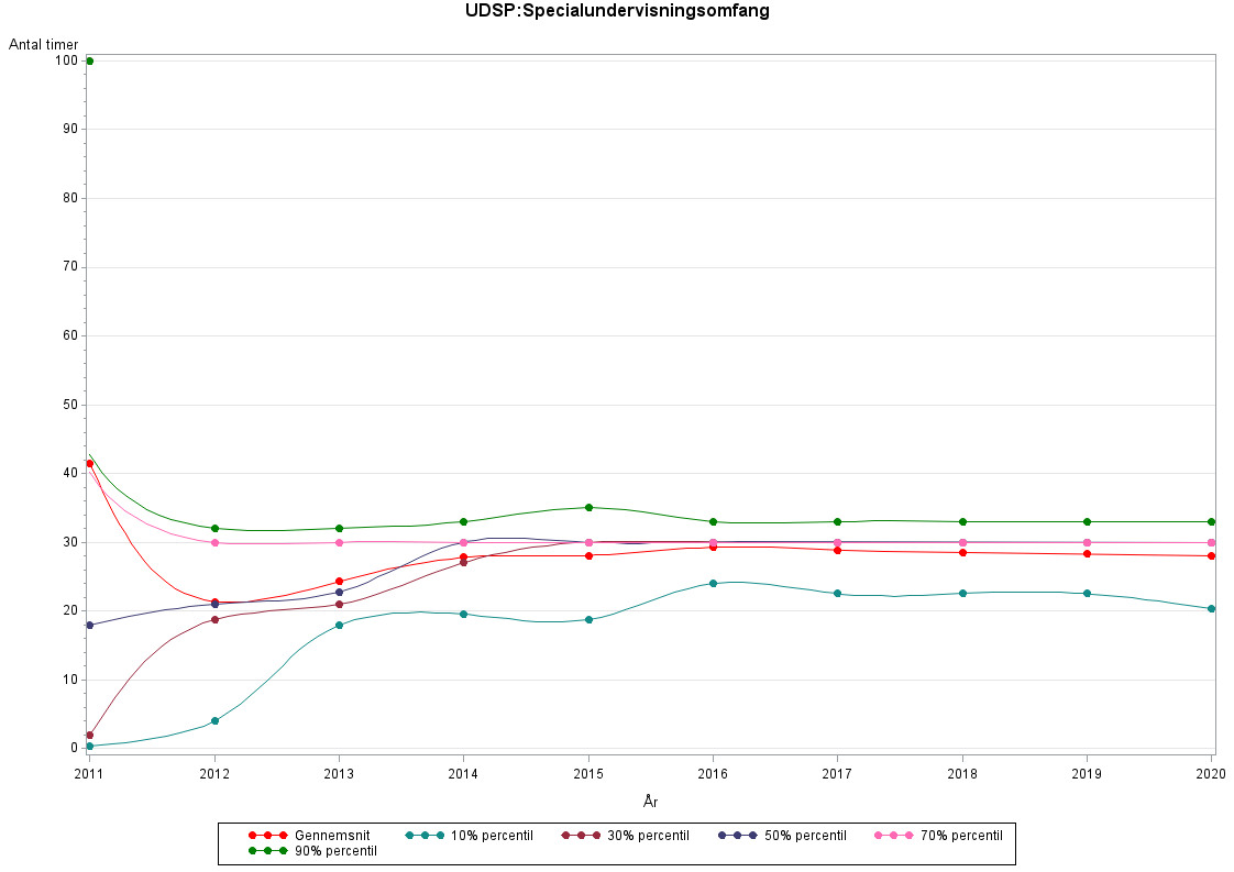 Specialundervisningsomfanget angiver det gennemsnitlige antal specialundervisningstimer om ugen for hvert enkelt specialundervisningstiltag.Detaljeret beskrivelse