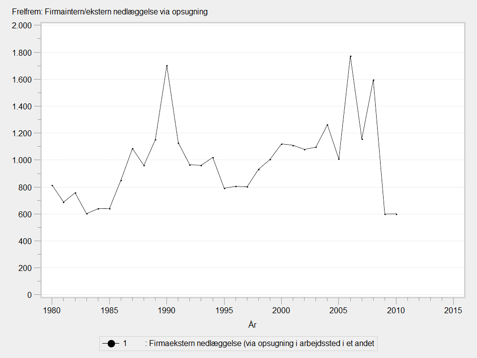 Grafen viser store udsving i midt- og slutfirserne. Årsagerne hertil er desværre ikke mulige at redegøre for. Udsvinget i 1987 skyldes højst sandsynligt en registreringsfejl i indberetningsmaterialet, idet der er tale om en del enkeltmandsvirksomheder, som nedlægges for at oprettes året efter igen.