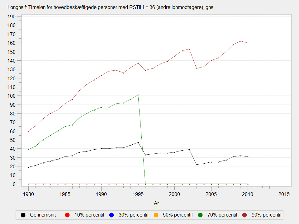 Faldet i 90 pct.- percentilen kan forklares ved ændringer i PSTILL-grupperingen. Andelen af lønmodtagere med koden 36 (anden lønmodtager) faldt således i 2003, idet andelen af lønmodtagere uden nærmere angivelse steg. Faldet skyldes ændringer i grundlaget for opgørelsen af arbejdsfunktionen for lønmodtagere.
