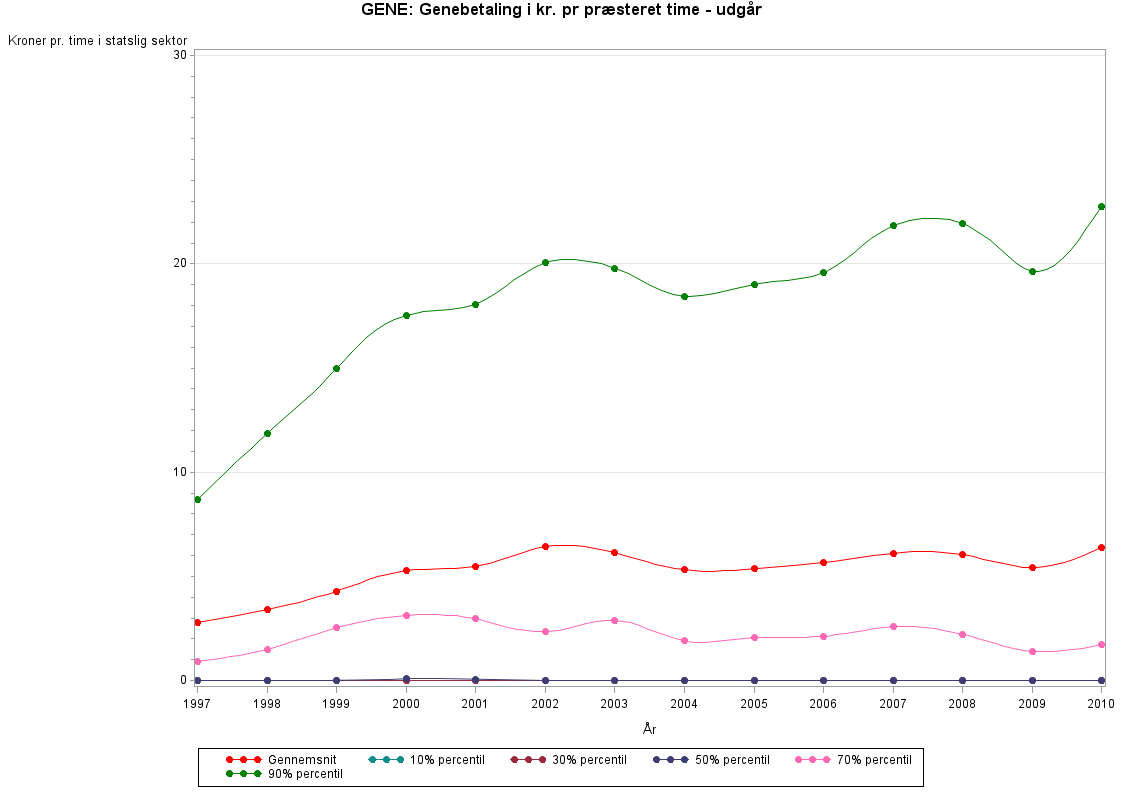 Genebetaling pr. præsteret time - udgårI 2009 blev GENE opsplittet i GENE_PRAE og OVERTID_PRAE i LONN registret. Variablen GENE findes dog i det gamle LON register indtil 2010.