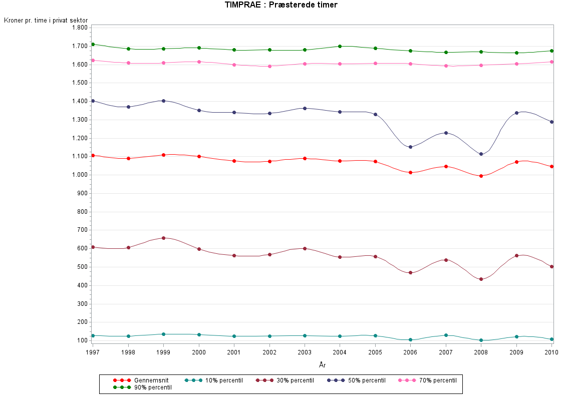 I populationen indgår alle lønmodtagere, der har et ansættelsesforhold og er ansat på normale vilkår. Et ansættelsesforhold er defineret i ansættelsesbevisloven. Ovenstående betyder, at følgende grupper ikke indgår i populationen: - Lønmodtagere, der aflønnes efter en usædvanlig lav sats som følge af handicap eller lignende - Lønmodtagere, der er rent provisionsaflønnede - Lønmodtagere, der ikke er beskattet efter de almindelige betingelser i Danmark, herunder fx sømænd ansat på skibe under internationale skibsregister - Udlændinge, der arbejder i Danmark, men beskattes efter hjemlandets regler - Udstationerede danskere, der aflønnes efter lokale regler. Danskere beskæftiget i udlandet, som aflønnes og beskattes efter de normale regler i Danmark, er omvendt med i statistikken. Yderligere afgrænsning for den private sektor: Lønmodtagere ansat i landbrug og fiskeri samt i virksomheder med en beskæftigelse svarende til 9 eller færre fuldtidsbeskæftigede indgår ikke i populationen, med mindre den enkelte arbejdsgiver frivilligt har indberettet til statistikken. Yderligere afgrænsning for stat, kommuner og regioner: Vederlagslønnede, særligt aflønnede, værnepligtige, ph.d.-studerende uden indberettet fravær, visse timelærere og studentermedhjælpere, elever og unge under 18 år indgår ikke i populationen. At populationens størrelse eventuelt ændre sig fra år til år, skyldes ikke nødvendigvis, at der er flere eller færre personer med i statistikken, men derimod, at der optræder styrebrud i registreringen af de enkelte personer, således at den samme person optræder flere gange i samme år (dvs. flere records), men med kortere ansættelseslængder i hver record. I de grafer og tabeller, der linkes til her på siden, er populationen for klassifikationsvariable afgrænset til antal records (ansættelsesforhold) i året. Dette er i modsætning til Statistikbanken, hvor man opgør antal fuldtidsbeskæftigede (beregnet som summen af beskbrok). I de grafer og tabeller der illustrerer timelønninger er disse opgjort som gennemsnit og percentiler uden vægtning i forhold til den målpopulation, som de enkelte records repræsenterer. I beregningen af gennemsnitlige løntimer opgjort i Statistikbanken er der derimod i beregningen af timelønninger vægtet med opregningsandel og antal præsterede timer (=oprandel*timprae). Sidstnævnte (timprae) korrigerer for, at ansættelsesforhold på få timer i året ikke vægter lige så meget som ansættelsesforhold, hvor personen har været ansat på fuld tid hele året.