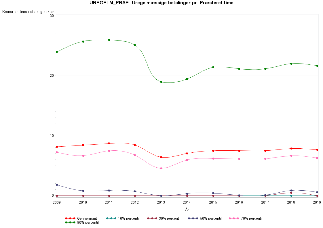 Uregelmæssige betalinger pr. præsteret time i kr.Uregelmæssige betalinger hed før 2009 UREGLM og blev ikke opgjort på timebasis men derimod på årsbasis. UREGLM findes i det gamle LON register frem til år 2010, mens UREGELM_PRAE findes i LONN registret fra år 2009.