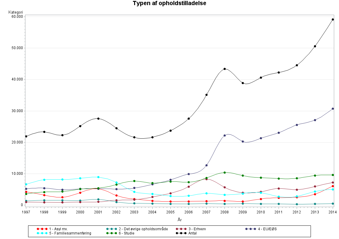 Overordnet om opholdstilladelsestype:Opholdstilladelsens type er defineret ved hjælp af tre variable fra Udlændingestyrelsen: Kategori, Grundlag og Forklar. Kategori er den overordnede gruppering af opholdstilladelserne i seks værdier: "Asyl mv", "Det øvrige opholdsområde", "Erhverv", "EU/EØS"," "Familiesammenføring", "Studie","Brexit" og "Ukraine særlov". Variablene Grundlag og Forklar bruges til at underopdele opholdstilladelsestypen fra Kategori. Grundlag og Forklar er ikke entydige og kan således ikke i alle tilfælde anvendes uden Kategori. I de fleste tilfælde vil der være tale om at kombinere Kategori og Grundlag til fx at inddele kategorien "EU/EØS" i "Lønarbejde", "Uddannelse" eller "Øvrige grunde" ud fra Grundlag. I nogle tilfælde kan det være nødvendigt at anvende det tredje niveau, Forklar. Fx kan kombination af Kategorien "Familiesammenført" og bestemte koder i Forklar bruges til at opdele familiesammenførte efter, om de er familiesammenførte til flygtninge, dansk/nordiske statsborgere eller andet, eller til at udvælge forskere ud fra Grundlaget "Fast-track" under Kategorien "Erhverv".