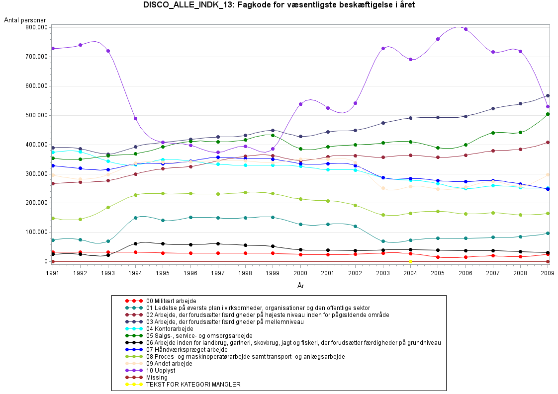 Det betyder, at opgørelser af DISCO_ALLE_INDK_13 før år 2003 kan indeholde DISCO-kode for arbejde i tidligere år for fx pensionister. Opgørelser kan evt. afgrænse populationen ved at lade variablen BESKST_13 antage en værdi la-vere end 6.