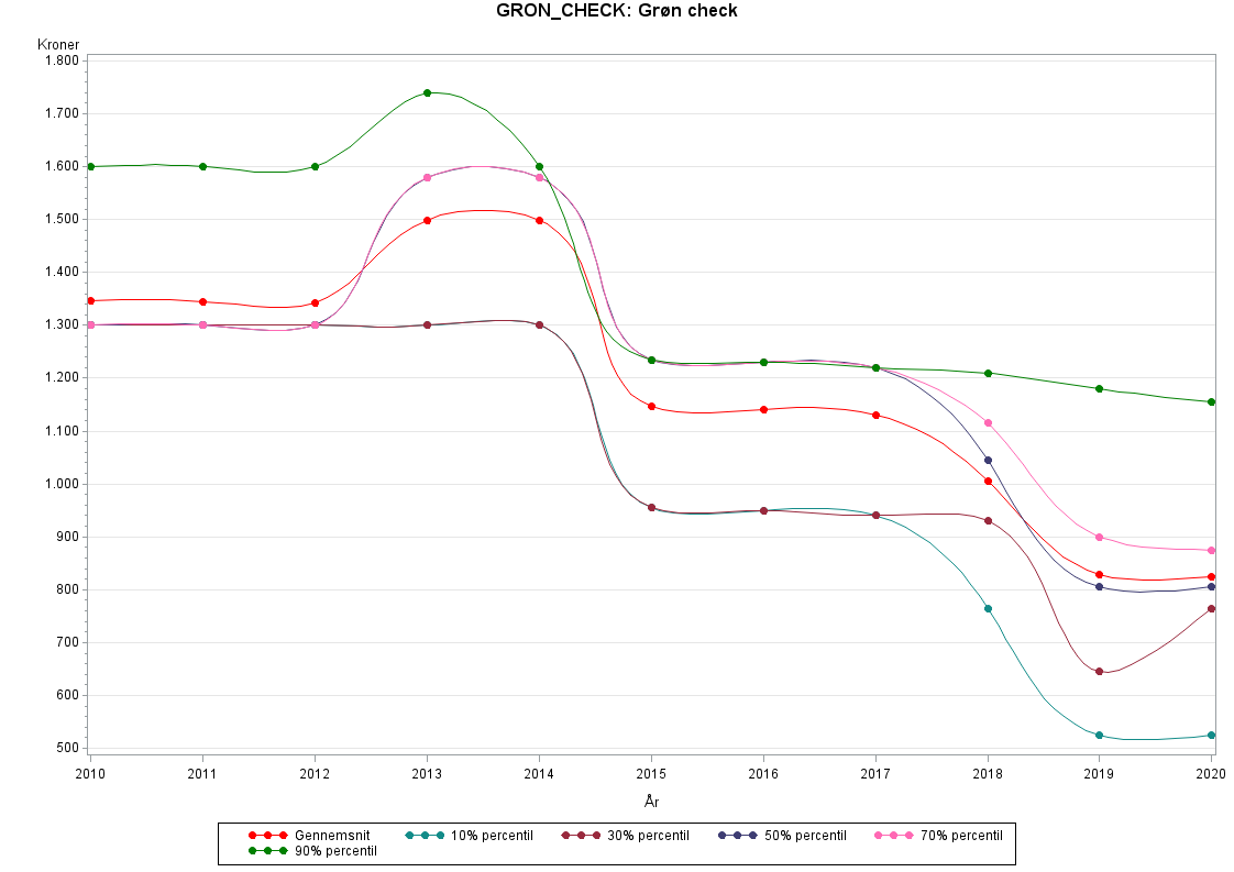 I forbindelse med skattereformen gældende fra 2010 hæves de grønne afgifter og der indføres lettelser i beskatningen, som især kommer lønmodtagere i den øvre ende til gode. Der er derfor samtidig indført den grønne check, som kompensation for personer i den de nedre indkomstgrupper. Kompensationwen er fuld for indkomster under en given bundgrænse, jf. detaljeretr beskrivelse, og aftrappes i takt med stigende indkomster.Den grønne check er skattefri.