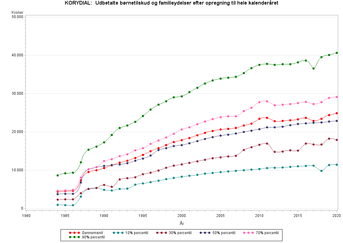 Børnefamilieydelse tildeles alle familier med børn under 18 år uafhængig af indkomstforhold. Børnetilskud tildeles enlige forældre, forældreløse o.l., børn af pensionister, børn født uden for ægteskab uden bidragsforpligtigelse, børn af enker/enkemænd, flerbørnsfamilier og uddannelsessøgende forældre.Bemærk, at variablen KORYDIAL er et samlet beløb udbetalt til en forælder for alle børn under 18 år i familien.