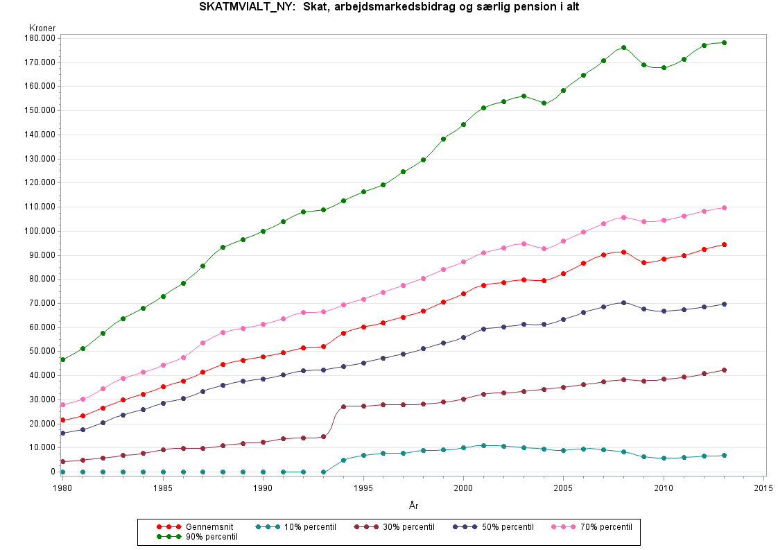 1994 inkluderes arbejdsmarkedsbidrag, og 1998-2003 indeholder variablen også særligt pensionsbidrag.