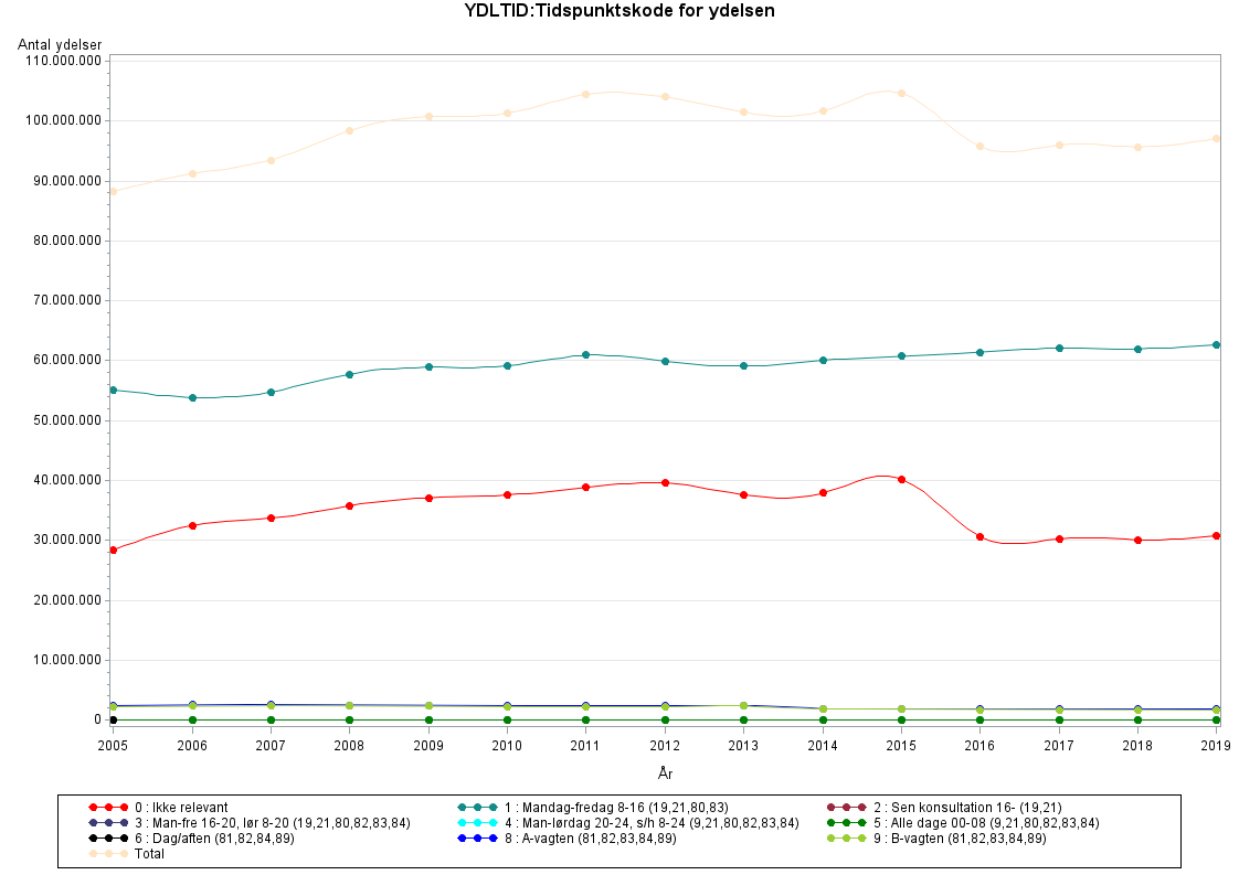 YDLTID (tidspunktkode for ydelsen) angiver, på hvilket tidspunkt af døgnet ydelsen er givet. Hvis ydelsen er givet i en weekend, vil det også fremgå.YDLTID har betydning for honoraret, idet honoraret er større i aftentimer og i weekender.