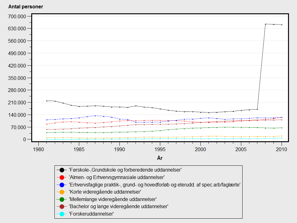 Til og med skoleåret 2005/06 er der kun blevet indsamlet uddannelsesoplysninger fra grundskolens 8., 9., og 10. klasse. Fra og med skoleåret 2006/07 indsamles der oplysninger fra og med børnehaveklassen, hvilket i 2008 betyder en stigning i personer med en igangværende grundskoleuddannelse.