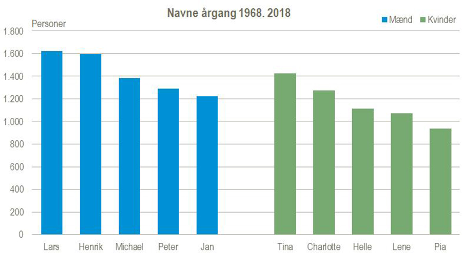 Figuren viser at Lars og Tina er de mest almindelige drenge- og pigenavne blandt de personer, som fylder 50 år i 2018, og som er født i Danmark. 1.620 hedder Lars, mens 1.425 hedder Tina. Efter Lars og Tina følger Henrik og Michael for mænd og Charlotte og Helle for kvinder. I hele befolkningen er Peter og Anne mest populære. Lars er på en fjerdeplads blandt alle drengenavne, mens Tina ligger nummer 20 blandt pigerne.