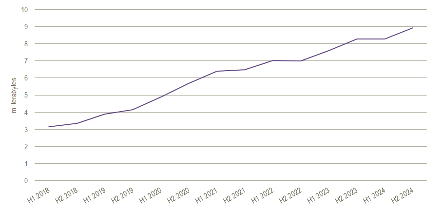 As the broadband capacity in Denmark has expanded, internet usage has become increasingly intensive among the population. Most households have access to the internet around the clock, and we are streaming and downloading data like never before, e.g. with tv series, video clips, music, podcasts, etc. Thus, we are experiencing a steep rise in data traffic, which has more than doubled in six years - from 3.3 m terabytes in the second half of 2018 to 8,9 m terabytes in the second half of 2024.