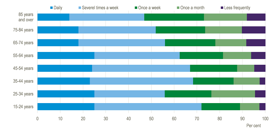 Of the 15-24-year-olds, 89 per cent used the services at least once a week. The 85-89-year-olds are the least active with 73 per cent using the services at least once a week.