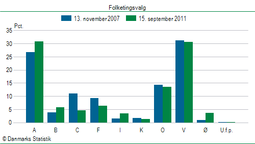 | Stemmer | | Parti | Antal | Pct. | | | | A. Socialdemokratiet | 13.303 | 30,9% | | B. Radikale Venstre | 2.454 | 5,7% | | C. Det Konservative Folkeparti | 1.991 | 4,6% | | F. SF - Socialistisk Folkeparti | 2.704 | 6,3% | | I. Liberal Alliance | 1.448 | 3,4% | | K. Kristendemokraterne | 573 | 1,3% | | O. Dansk Folkeparti | 5.839 | 13,6% | | V. Venstre, Danmarks Liberale Parti | 13.158 | 30,6% | | Ø. Enhedslisten - De Rød-Grønne | 1.582 | 3,7% | | Uden for partierne | 12 | 0,0% | | I alt gyldige stemmer | 43.064 | | | Blanke stemmer | 271 | | Andre ugyldige stemmer | 119 | | I alt ugyldige stemmer | 390 | | | I alt afgivne stemmer | 43.454 | |