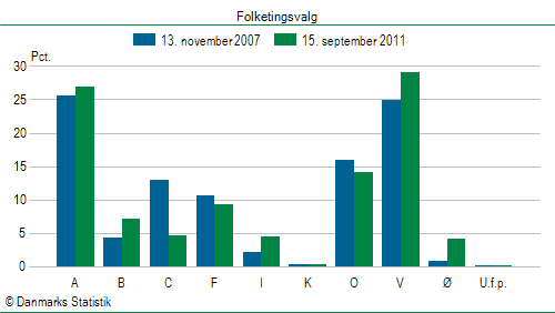 | Stemmer | | Parti | Antal | Pct. | | | | A. Socialdemokratiet | 11.791 | 26,8% | | B. Radikale Venstre | 3.112 | 7,1% | | C. Det Konservative Folkeparti | 2.013 | 4,6% | | F. SF - Socialistisk Folkeparti | 4.112 | 9,4% | | I. Liberal Alliance | 1.960 | 4,5% | | K. Kristendemokraterne | 166 | 0,4% | | O. Dansk Folkeparti | 6.179 | 14,1% | | V. Venstre, Danmarks Liberale Parti | 12.774 | 29,1% | | Ø. Enhedslisten - De Rød-Grønne | 1.825 | 4,2% | | Uden for partierne | 16 | 0,0% | | I alt gyldige stemmer | 43.948 | | | Blanke stemmer | 300 | | Andre ugyldige stemmer | 137 | | I alt ugyldige stemmer | 437 | | | I alt afgivne stemmer | 44.385 | |