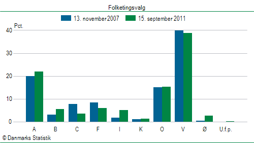 | Stemmer | | Parti | Antal | Pct. | | | | A. Socialdemokratiet | 9.487 | 21,9% | | B. Radikale Venstre | 2.425 | 5,6% | | C. Det Konservative Folkeparti | 1.559 | 3,6% | | F. SF - Socialistisk Folkeparti | 2.587 | 6,0% | | I. Liberal Alliance | 2.197 | 5,1% | | K. Kristendemokraterne | 520 | 1,2% | | O. Dansk Folkeparti | 6.642 | 15,3% | | V. Venstre, Danmarks Liberale Parti | 16.862 | 38,9% | | Ø. Enhedslisten - De Rød-Grønne | 1.098 | 2,5% | | Uden for partierne | 23 | 0,1% | | I alt gyldige stemmer | 43.400 | | | Blanke stemmer | 323 | | Andre ugyldige stemmer | 123 | | I alt ugyldige stemmer | 446 | | | I alt afgivne stemmer | 43.846 | |