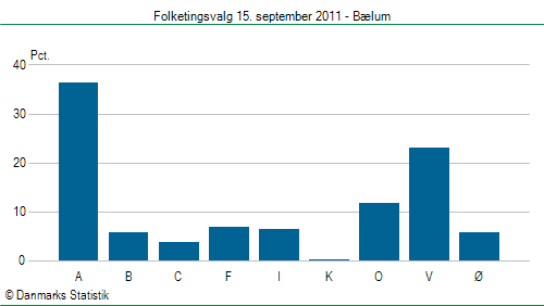| Stemmer | | Parti | Antal | Pct. | | | | A. Socialdemokratiet | 378 | 36,4% | | B. Radikale Venstre | 60 | 5,8% | | C. Det Konservative Folkeparti | 39 | 3,8% | | F. SF - Socialistisk Folkeparti | 71 | 6,8% | | I. Liberal Alliance | 67 | 6,5% | | K. Kristendemokraterne | 2 | 0,2% | | O. Dansk Folkeparti | 122 | 11,8% | | V. Venstre, Danmarks Liberale Parti | 240 | 23,1% | | Ø. Enhedslisten - De Rød-Grønne | 59 | 5,7% | | I alt gyldige stemmer | 1.038 | | | Blanke stemmer | 11 | | Andre ugyldige stemmer | 3 | | I alt ugyldige stemmer | 14 | | | I alt afgivne stemmer | 1.052 | |