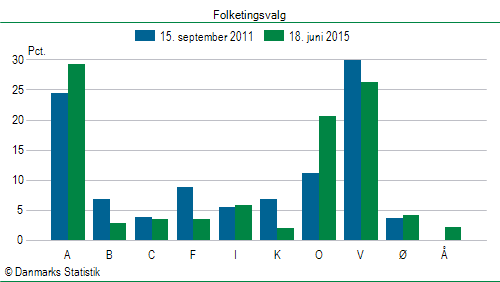 | Stemmer | | Parti | Antal | Pct. | | | | A. Socialdemokratiet | 10.762 | 29,3% | | B. Radikale Venstre | 1.017 | 2,8% | | C. Det Konservative Folkeparti | 1.281 | 3,5% | | F. SF - Socialistisk Folkeparti | 1.296 | 3,5% | | I. Liberal Alliance | 2.107 | 5,7% | | K. Kristendemokraterne | 720 | 2,0% | | O. Dansk Folkeparti | 7.563 | 20,6% | | V. Venstre, Danmarks Liberale Parti | 9.642 | 26,3% | | Ø. Enhedslisten - De Rød-Grønne | 1.496 | 4,1% | | Å. Alternativet | 799 | 2,2% | | Uden for partierne | 44 | 0,1% | | I alt gyldige stemmer | 36.727 | | | Blanke stemmer | 349 | | Andre ugyldige stemmer | 98 | | I alt ugyldige stemmer | 447 | | | I alt afgivne stemmer | 37.174 | |
